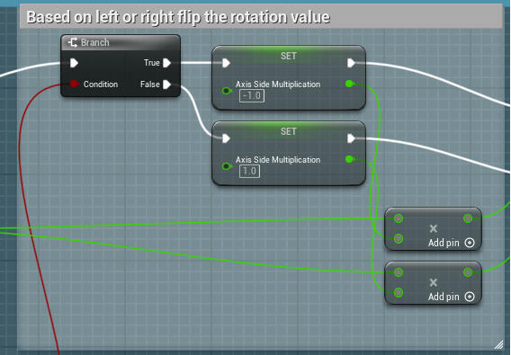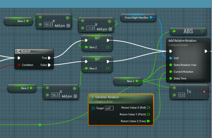 This was putting everything together. After multiplying all the 1's and -1's into the Variable NewZ. I then added it to the relative rotation by lerping the old position to the new position in the "Add Relative Rotation" graph