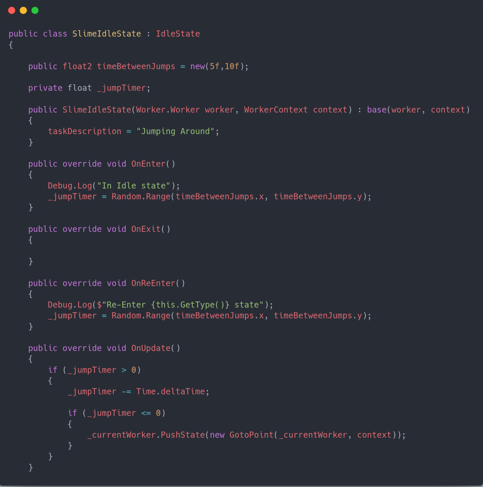 - Led a team of 7-Programmed the player movement- Programmed the FPS Mechanics- Programmed 9 Custom AI behaviors (3 Enemies each with 3 variants)- Programmed a Save System that saves stats after every run- Programmed the growing of the crops-Collaborated with the Designers on the look/feel of enemies-Programmed custom UI Behavior to differentiate Top Down/FPS