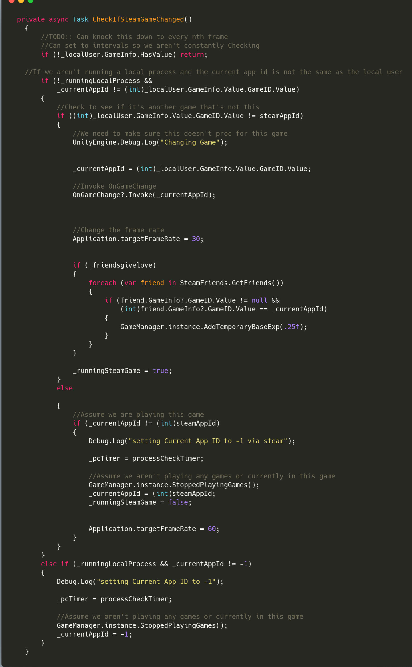 Using Facepunch.Steamworks as a foundation, I began integrating the project with the Steam Client. I was pleasantly surprised by the depth of the API; it allows you to track friend activity (foreshadowing!) and monitor the local user's current session.The first technical challenge was detecting when the user was playing a game other than Pobbi. Fortunately, every title on the platform is assigned a unique AppID. I implemented a check that constantly compares the active AppID against Pobbi’s own ID. If they don't match, the system knows the user has switched focus to a new game.