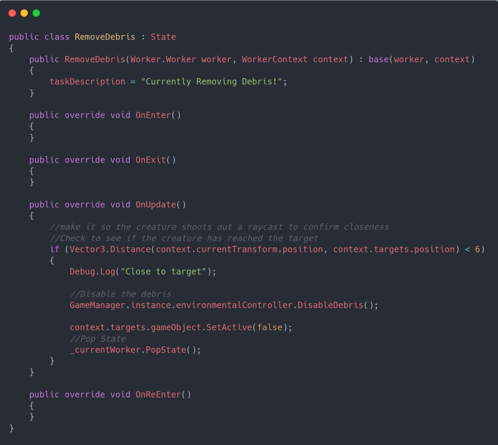 I led a team of 7 people, including 2 programmers, 3 artists, and 2 sound designers. I was able to keep everyone on track by giving them tasks and playing to their strengths. I knew what I wanted and planned accordingly. I also picked up the slack where it needed to be picked up. For myself, I did a lot of coding that was out of my comfort zone, such as AI and Grid Based things, and I learned a lot. I also helped out with the growing process. Whenever the other programmer needed something, I was there ready to help. I would love to work with this team again and make something this ambitious. We connected well, had a lot of fun, and it reminded me why I love doing this.